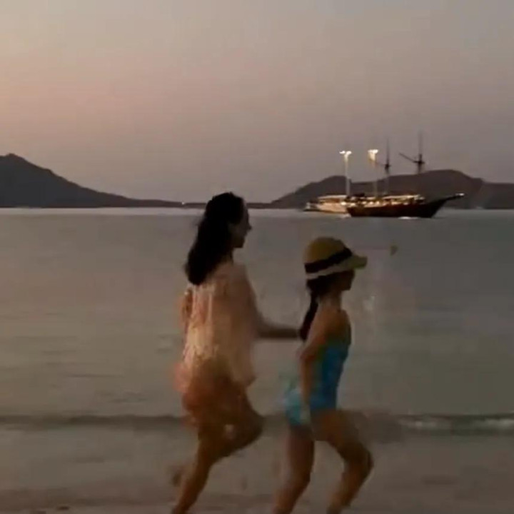 章子怡牵着孩子们一起在海边追逐奔跑,跟孩子们在一起,感觉章子怡玩得比孩子们还要开心呢,童心未泯好可爱。